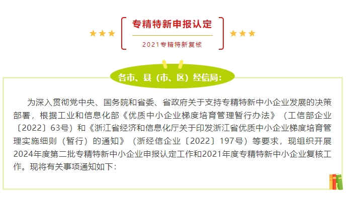 專精特新申報(bào)認(rèn)定2021專精特新復(fù)核各市、縣(市、區(qū))經(jīng)信局: 為深入貫徹黨中央、國(guó)務(wù)院和省委、省政府關(guān)于支持專精特新中小企業(yè)發(fā)展的決策部署,根據(jù)工...