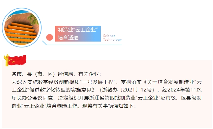 各市、縣(市、區(qū))經(jīng)信局,有關(guān)企業(yè):為深入實(shí)施數(shù)字經(jīng)濟(jì)創(chuàng)新提質(zhì)“一號(hào)發(fā)展工程”,貫徹落實(shí)《關(guān)于培育發(fā)展制造業(yè)“云上企業(yè)”促進(jìn)數(shù)字化轉(zhuǎn)型的實(shí)施意見》(浙數(shù)辦〔2021〕12號(hào)),經(jīng)2024年第11次廳長(zhǎng)...