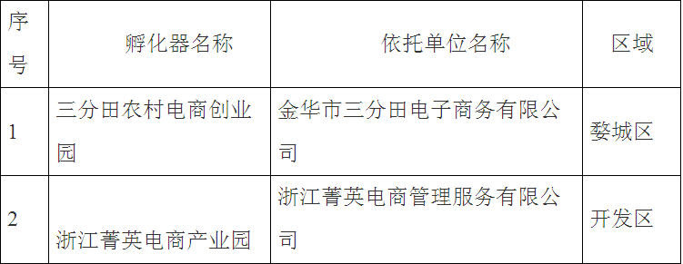 根據(jù)《金華市級科技孵化器認(rèn)定與管理辦法》(金市科字〔2010〕66號),擬認(rèn)定三分田農(nóng)村電商創(chuàng)業(yè)園、浙江菁英電商產(chǎn)業(yè)園2家單位為金華市級科技孵化器,現(xiàn)予以公示,接受社會(huì)監(jiān)督。如有異議,請來人來電反映,以個(gè)人名義反映的,請署真實(shí)姓名;以單位反映的,須加蓋單位公章;匿名反映的材料不予受理。公示日期為12月19日至12月26日。