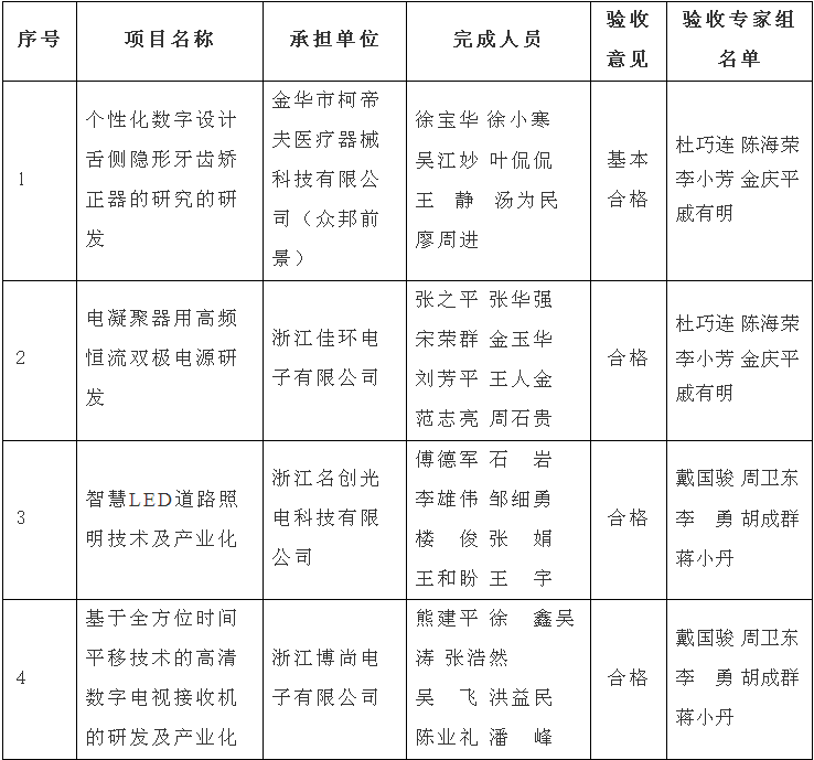 根據(jù)《金華市級科技計劃項目驗收管理辦法》(金市科字〔2015〕83號)規(guī)定,現(xiàn)將金華市柯帝夫醫(yī)療器械科技有限公司(眾邦前景)、浙江佳環(huán)電子有限公司、浙江名創(chuàng)光電科技有限公司、浙江博尚電子有限公司承擔的《個性化數(shù)字設計舌側隱形牙齒矯正器的研究的研發(fā)》、《電凝聚器用高頻恒流雙極電源研發(fā)》、《智慧LED道路照明技術及產業(yè)化》和《基于全方位時間平移技術的高清數(shù)字電視接收機的研發(fā)及產業(yè)化》4個市級科技計劃項目驗收結果予以公示,接受社會監(jiān)督,公示期從2018年1月10日至1月17日止。