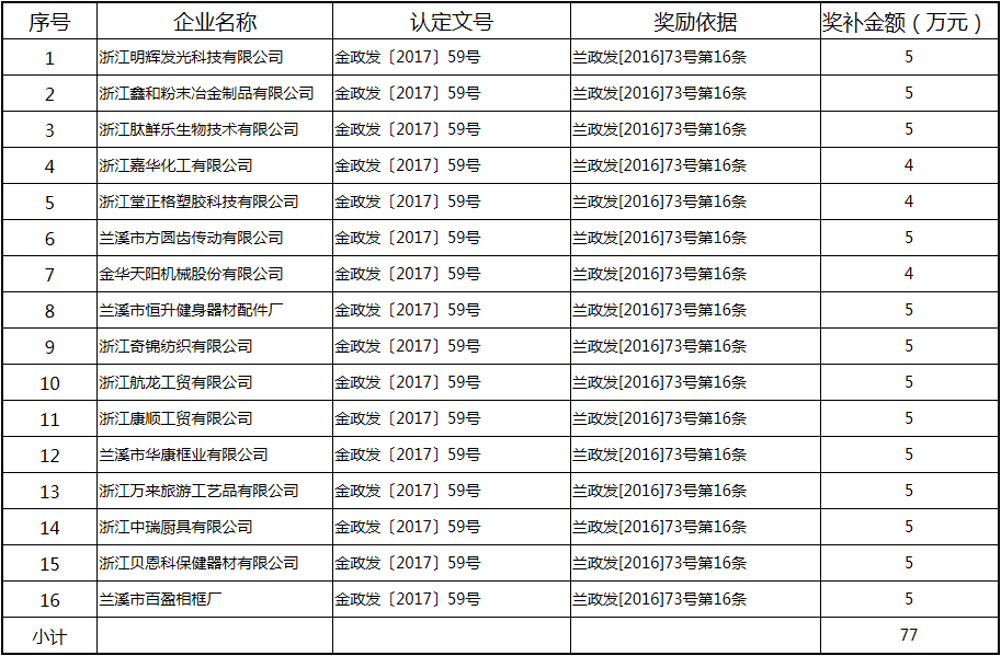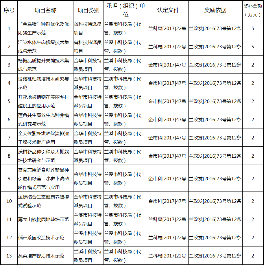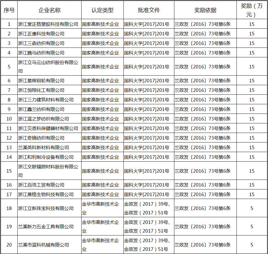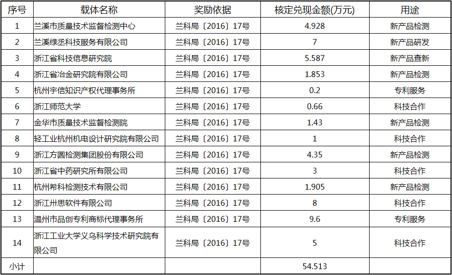 根據(jù)《關(guān)于實施創(chuàng)新驅(qū)動戰(zhàn)略大力推進大眾創(chuàng)業(yè)萬眾創(chuàng)新的若干意見》(蘭政發(fā)〔2016〕73號)和《蘭溪市科技創(chuàng)新券實施管理辦法》(蘭科局〔2016〕17號)等文件精神,現(xiàn)將2017年度科技創(chuàng)新專項資金獎勵及補助方案予以公示,公示期五個工作日,自2018年 7月3日至 7月9日。公示期內(nèi),如對公示擬補助對象有疑議的,請及時向市科技局辦公室反映。