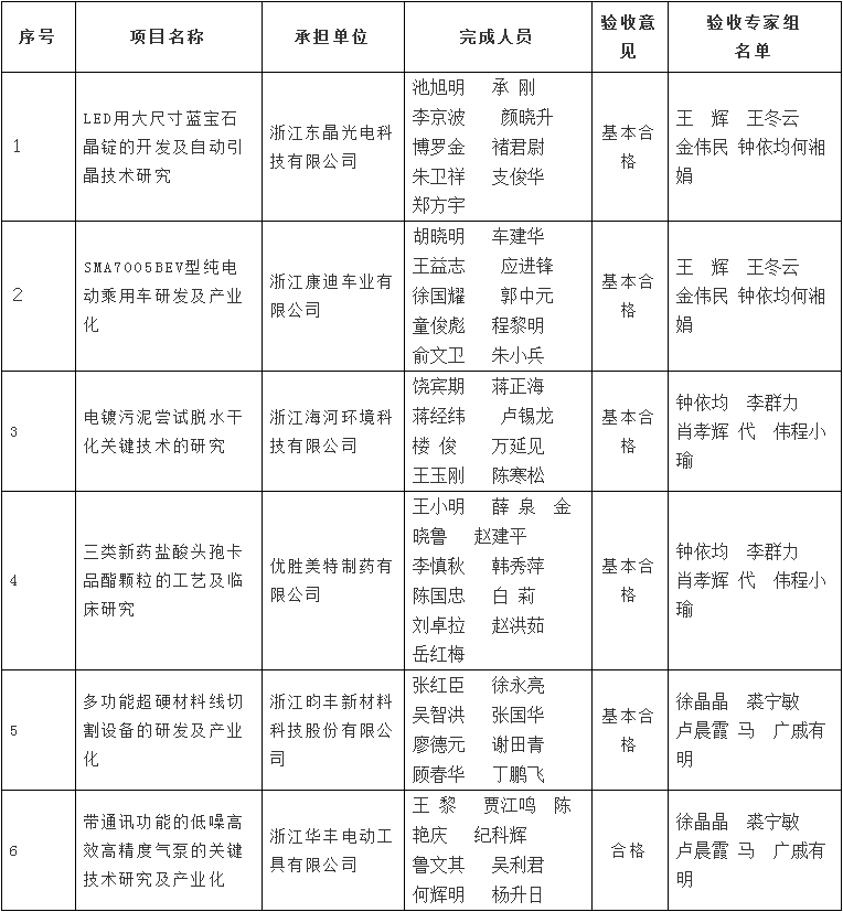 根據(jù)《金華市級(jí)科技計(jì)劃項(xiàng)目驗(yàn)收管理辦法》(金市科字〔2015〕83號(hào))規(guī)定,現(xiàn)將浙江東晶光電科技有限公司、浙江康迪車業(yè)有限公司、浙江海河環(huán)境科技有限公司、優(yōu)勝美特制藥有限公司、浙江昀豐新材料科技股份有限公司、浙江華豐電動(dòng)工具有限公司承擔(dān)的《LED用大尺寸藍(lán)寶石晶錠的開(kāi)發(fā)及自動(dòng)引晶技術(shù)研究》、《SMA7005BEV型純電動(dòng)乘用車研發(fā)及產(chǎn)業(yè)化》、《電鍍污泥嘗試脫水干化關(guān)鍵技術(shù)的研究》、《三類新藥鹽酸頭孢卡品酯顆粒的工藝及臨床研究》、《多功能超硬材料線切割設(shè)備的研發(fā)及產(chǎn)業(yè)化》、《帶通訊功能的低噪高效高精度氣泵的關(guān)鍵技術(shù)研究及產(chǎn)業(yè)化》6個(gè)市級(jí)科技計(jì)劃項(xiàng)目驗(yàn)收結(jié)果予以公示,接受社會(huì)監(jiān)督,公示期從2018年7月20日至7月27日止。
