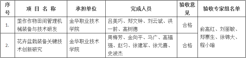 根據(jù)《金華市級科技計劃項目驗收管理辦法》(金市科字〔2015〕83號)規(guī)定,現(xiàn)將金華職業(yè)技術(shù)學(xué)院承擔(dān)的《壟作作物田間管理機(jī)械裝備與技術(shù)研發(fā)》等市級科技計劃項目驗收結(jié)果予以公示,接受社會監(jiān)督,公示期從2018年7月23日至2018年7月29日止。任何單位和個人對驗收意見持有異議的,應(yīng)當(dāng)在公示期內(nèi)書面向市科技局提出異議,單位應(yīng)采用書面形式并加蓋公章,個人應(yīng)采用實名提出異議。