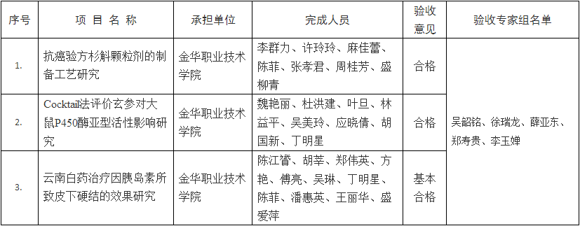 根據(jù)《金華市級科技計劃項目驗收管理辦法》(金市科字〔2015〕83號)規(guī)定,現(xiàn)將金華職業(yè)技術(shù)學院承擔的《抗癌驗方杉斛顆粒劑的制備工藝研究》市級科技計劃項目驗收結(jié)果予以公示,接受社會監(jiān)督,公示期從2018年7月23日至2018年7月29日止。任何單位和個人對驗收意見持有異議的,應當在公示期內(nèi)書面向市科技局提出異議,單位應采用書面形式并加蓋公章,個人應采用實名提出異議。