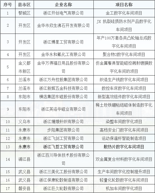 2018年金華市“數(shù)字化車間”示范項(xiàng)目名單