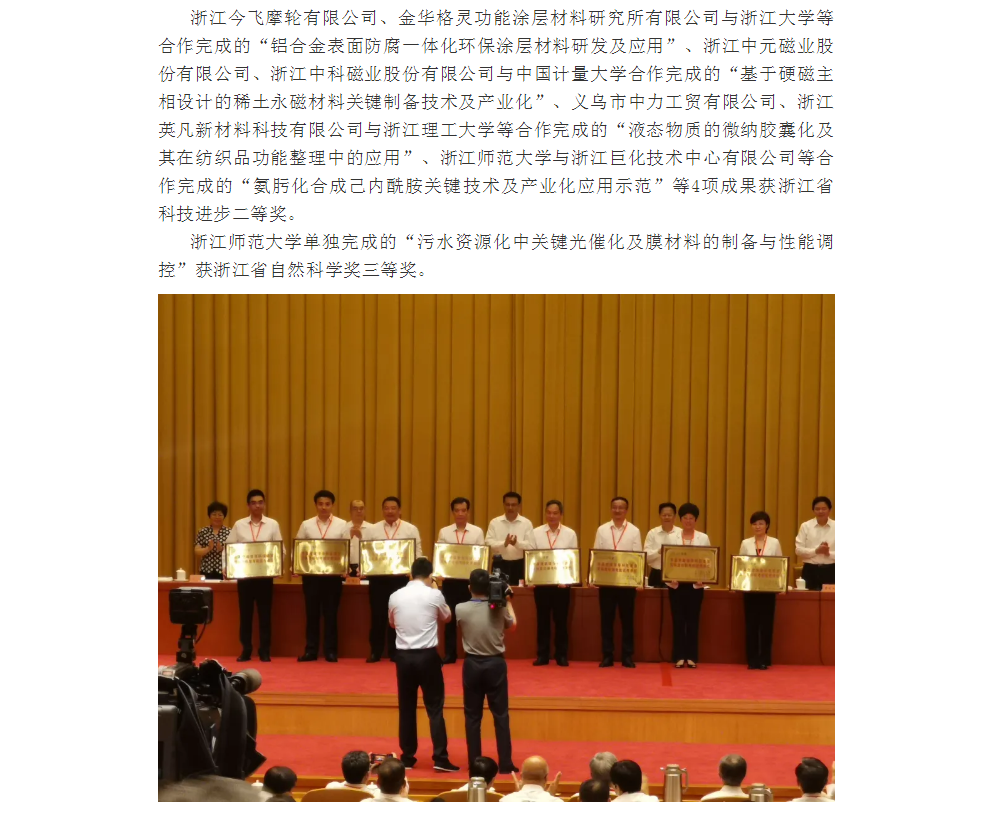 浙江萬(wàn)里揚(yáng)股份有限公司牽頭與北汽福田汽車股份有限公司、金華市計(jì)量質(zhì)量科學(xué)研究院等合作完成的“商用車變速器輕量化、模塊化技術(shù)的研究及產(chǎn)品開發(fā)”、橫店集團(tuán)東磁股份有限公司單獨(dú)完成的“無(wú)線充電用高磁導(dǎo)率FS500鐵氧體片”、浙江道明光電科技有限公司與道明光學(xué)股份有限公司完成的“符合ECE R104微棱鏡型反光膜關(guān)鍵技術(shù)研發(fā)及產(chǎn)業(yè)化”、金華市中醫(yī)醫(yī)院?jiǎn)为?dú)完成的“脾腎陽(yáng)虛血瘀型腎衰的理論基礎(chǔ)及腎毒寧方干預(yù)機(jī)制研究”、金華市公路與運(yùn)輸管理中心牽頭與東南大學(xué)等合作完成的“浙江省重載干線公路車轍機(jī)理與路基路面一體化防治技術(shù)”、浙江綠巨人生物技術(shù)有限公司與浙江大學(xué)等合作完成的“適宜糖尿病食用高抗性淀粉水稻種質(zhì)創(chuàng)制、機(jī)理特性及產(chǎn)業(yè)開發(fā)”、義烏市中醫(yī)醫(yī)院與浙江省立同德醫(yī)院合作完成的“丹溪學(xué)派的傳承發(fā)展與著述研究”、金華市農(nóng)業(yè)科學(xué)研究院、金華市荊龍生物科技有限公司、浙江壽仙谷醫(yī)藥股份有限公司與浙江農(nóng)林大學(xué)等合作完成的“金線蓮優(yōu)異種質(zhì)創(chuàng)新及生態(tài)栽培關(guān)鍵技術(shù)研究與應(yīng)用”、國(guó)網(wǎng)浙江省電力有限公司金華供電公司與杭州電力設(shè)備制造有限公司等合作完成的“新型開關(guān)設(shè)備態(tài)勢(shì)感知與智能運(yùn)維關(guān)鍵技術(shù)及產(chǎn)業(yè)化”、東陽(yáng)市人民醫(yī)院與杭州電子科技大學(xué)等合作完成的“面向健康養(yǎng)老的人機(jī)共融智能監(jiān)陪護(hù)系統(tǒng)關(guān)鍵技術(shù)及應(yīng)用”、浙江凱文磁業(yè)有限公司與中國(guó)計(jì)量大學(xué)等合作完成的“新能源汽車用高耐熱沖擊釹鐵硼關(guān)鍵制備技術(shù)及其電機(jī)應(yīng)用”、浙江師范大學(xué)與杭州醫(yī)學(xué)院等合作完成的“基于浙江實(shí)踐的農(nóng)村衛(wèi)生發(fā)展策略研究”等12項(xiàng)成果獲浙江省科技進(jìn)步獎(jiǎng)三等獎(jiǎng)。