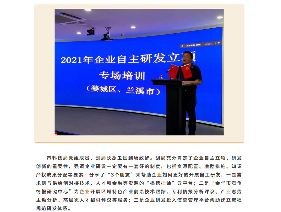 為進(jìn)一步加強(qiáng)企業(yè)研發(fā)項(xiàng)目登記管理,幫助企業(yè)掌握自主研發(fā)立項(xiàng)的思路、方法和系統(tǒng)操作,引導(dǎo)創(chuàng)新主體加大R&D研發(fā)投入,解讀企業(yè)研發(fā)經(jīng)費(fèi)加計(jì)扣除等科技政策。6月21日,在市科技局的指導(dǎo)下,市人才科創(chuàng)中心聯(lián)合婺城區(qū)和蘭溪市,組織2021年企業(yè)自主研發(fā)立項(xiàng)線上線下專(zhuān)場(chǎng)培訓(xùn)會(huì)在浙中科技大市場(chǎng)暨“揭榜掛帥”服務(wù)中心順利召開(kāi)。此次參加線上、線下培訓(xùn)人員共計(jì)160人左右。浙中科技大市場(chǎng)和金華市高新技術(shù)企業(yè)協(xié)會(huì)具體承辦。